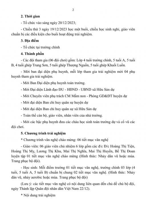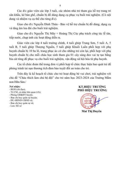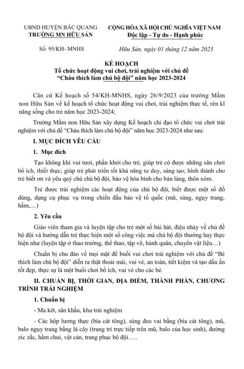 Kế hoạch tổ chức vui chơi trải nghiệm với chủ đề “Cháu thích làm chú bộ đội” năm học 2023-2024