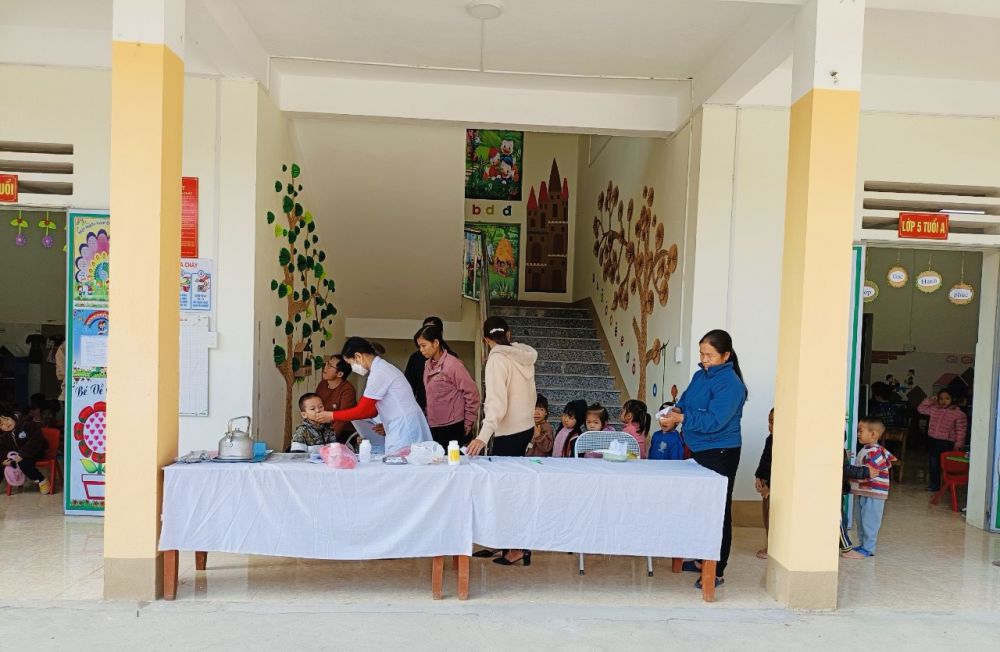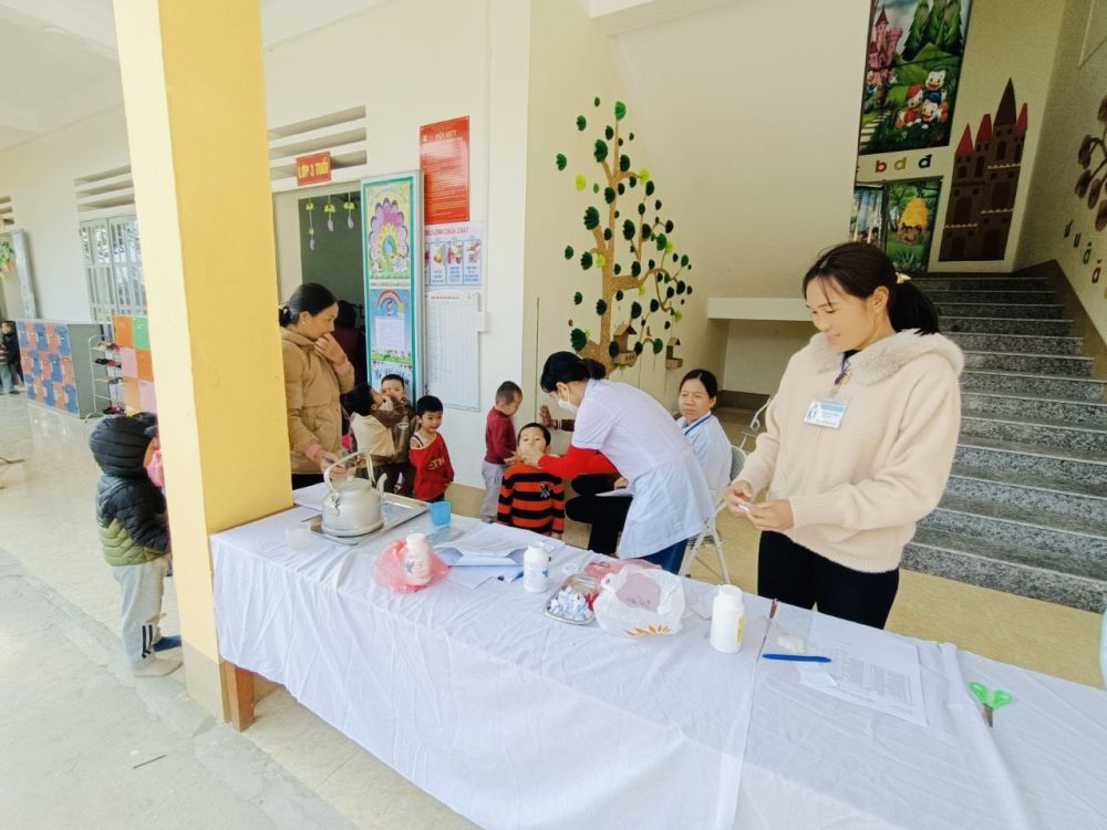 Trường Mầm non Hữu Sản phối hợp với Trạm y tế xã khám sức khỏe định kỳ, uống thuốc tẩy giun và uống Vitamin cho các cháu học sinh toàn trường - Đợt 2 năm học 2023-2024
